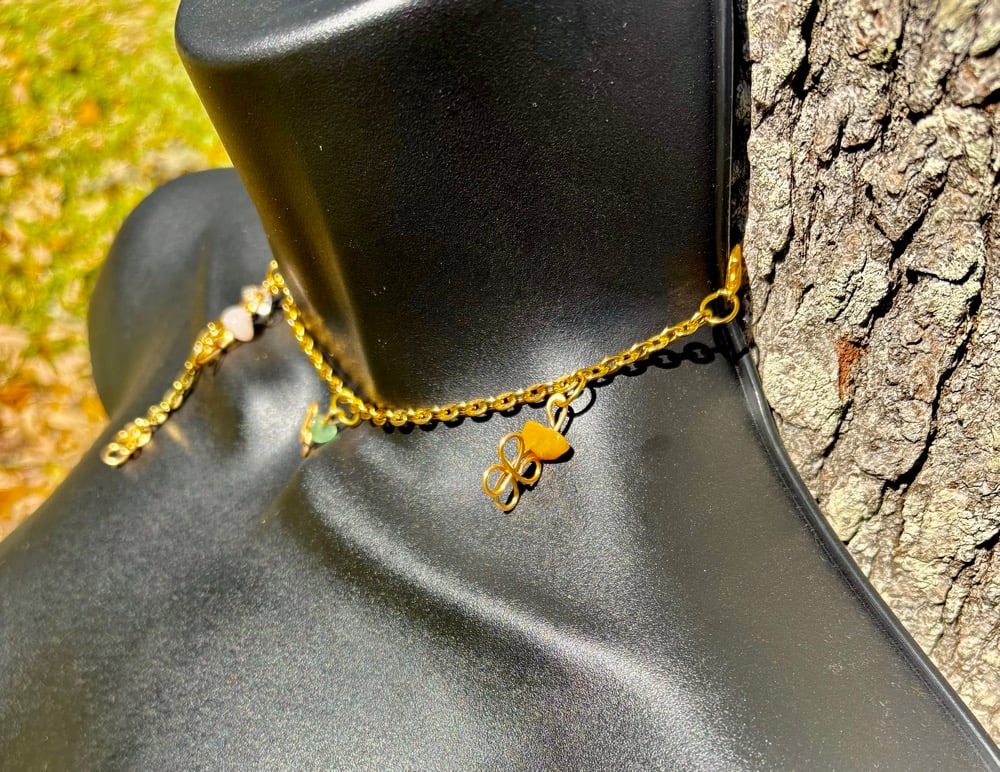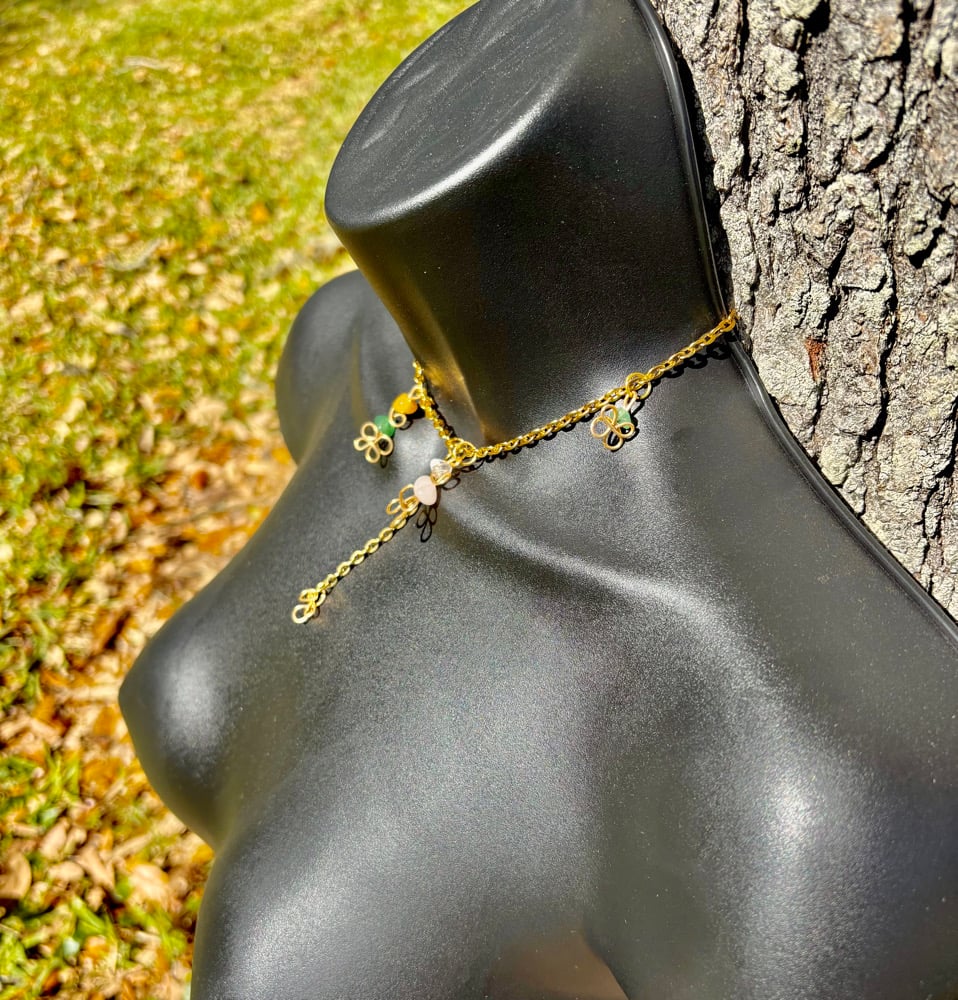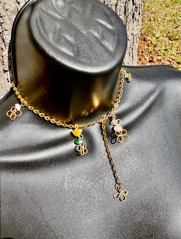 Details: • Gemstones: Rose Quartz, Green Aventurine, Yellow Aventurine, Clear Quartz • Hand-formed wire clovers + swirl detailing • Gold-plated copper wire (tarnish-resistant) • Stainless steel chain • Handmade with intention and care